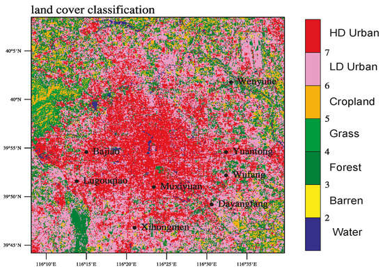 Eight road weather station sites were chosen to perform the assimilation. Each of these sites was located either on a major expressway that links Beijing to other cities in China or on a main road within Beijing. Figure 1 is the land cover classification of Beijing and the locations of the eight road sites. The urban land use and land cover (LULC) was classified based on the 30-m-resolution Landsat Thematic Mapper (TM) images [17]. LULC was classified as seven types, that is, high density (HD) urban, low density (LD) urban, water body, barren, forest, cropland and grassland. The LULC for Wufang and Wenyuhe site was LD-urban; while it was HD-urban for all other six sites.