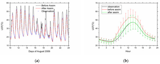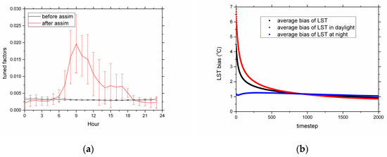 First, we checked the site average diurnal cycle of the tuned factor for the control run (Figure 2a). The values of the tuned factor were between 0.00295 and 0.00334 and did not vary much during the assimilation window. So, it could be considered as an ideal tuned factor in the impervious LST assimilation.