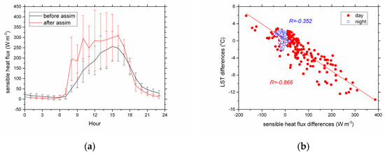 (a) Site average diurnal cycle of the sensible heat flux before and after assimilation; (b) comparison of the site average sensible heat flux differences with the LST differences from the control run and contrast run.