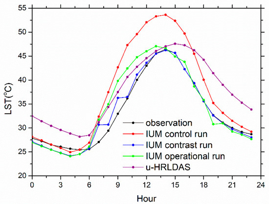 To prove the advantage of the variational assimilation algorithm, the impervious LST simulation results from the urbanized high-resolution land data assimilation system (u-HRLDAS) [23], which is based on a single layer urban canopy model (Noah/SLUCM) [20], were compared with the simulation results of the IUM in Yuantong Site. Compared with the simulation results of u-HRLDAS, the simulation results of the operational run definitely improved. The bias decreased about 79%; the RMSE decreased about 24%.