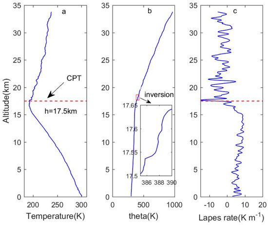 (a) The temperature profile (the red dotted line indicates the cold point tropopause (CPT), and the height is 17.5 km). (b) The potential temperature profile, where the profile in the red box is enlarged to observe the inversion areas. (c) Temperature lapse rate at 12 UT on 31 May 2018.