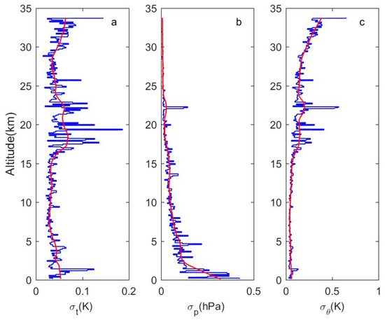 Noise standard deviation of (a) temperature, (b) pressure and (c) potential temperature (red curve: smoothed profiles of these noise estimates).