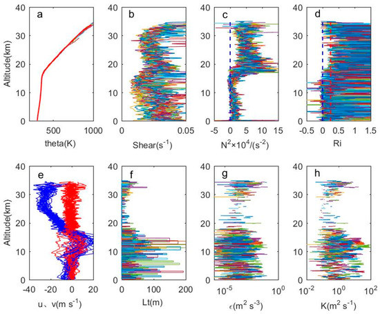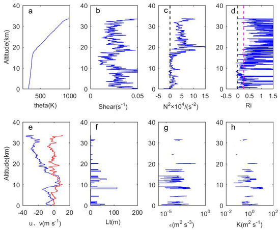 Figure 3a–h respectively show the profiles of potential temperature, vertical wind shear (the square root of the denominator of the fraction in Equation (14), buoyancy frequency, gradient Richardson number, horizontal wind component, Thorpe length, energy dissipation rate and turbulent diffusivity calculated at 12 UT on 31 May 2018. In Figure 3b, the maximum wind shear is between 18 and 20 km and is significantly higher than the surrounding area, which is caused by the tropical easterly jet stream. The buoyancy frequency in Figure 3c is significantly larger in the stratosphere than that in the troposphere. There are some negative values of buoyancy frequency in the troposphere, corresponding to the static instability region in the atmosphere, while in the stratosphere, buoyancy frequency is mainly dominated by positive values. Figure 3d shows that there are significant differences in the main mechanisms of turbulence between the stratosphere and the troposphere. Regions where < 0 and 0 << 0.25 both exist in the troposphere, indicating that there is both thermal and mechanical turbulence in the troposphere. In the stratosphere, the Richardson number is significantly increased, showing that there is mainly mechanical turbulence in the stratosphere. Figure 3e shows that the meridional and zonal components of the smoothed horizontal wind speed vary with height. It can be seen that the zonal wind is significantly larger than the meridional wind, and the values of u and v are significantly increased near the tropopause where the upper-level jet stream is formed. Figure 3f shows the distribution of the Thorpe length after the real overturn is selected. The maximum value of is around 10 km, corresponding to the area with the largest wind shear. The distribution of is mainly concentrated between 10 and 20 km. The turbulence with static instability in the troposphere is widespread, corresponding to the relatively large Thorpe scale, while static instability in the stratosphere is rare, and the inversion scale of the profile is small, with a correspondingly small Thorpe’s scale. Figure 3g,h represent the distribution of the energy dissipation rate and the turbulent diffusion coefficient with height, respectively. It can be seen that the trends of the two have a good consistency. According to the formula of the turbulent diffusion coefficient calculated by the Thorpe method, , it can be seen that their small differences in the changing trend are due to the buoyancy frequency. The region where the maximum value of and exist match the region of the maximum value of the Thorpe length. It should be noted here that the instantaneous profile of is calculated according to whether the water vapor is saturated, and and are respectively selected to eliminate small-scale fluctuations and noise; a moving average in 200-m steps is applied to to obtain . When calculating and , we use the positive buoyancy frequency calculated from the sorted potential temperature profile.