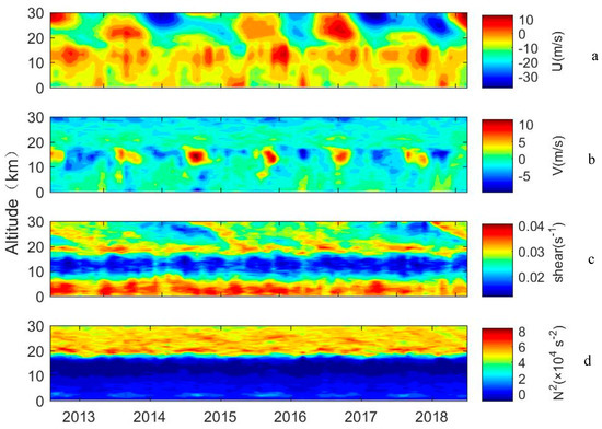 The monthly averaged (a) zonal wind, (b) meridional wind, (c) shear, (d) squared Brunt–Väisälä frequency from 2013–2018.