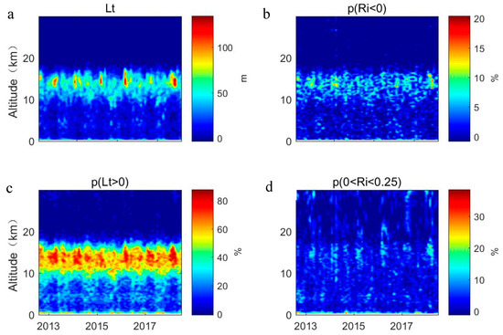 Because turbulence is highly intermittent and random in space and time, it is more reasonable to express the frequency of turbulence in terms of the occurrence rates in a fixed area. Figure 6a shows the monthly means for the Thorpe length , Figure 6b shows the monthly occurrence rates of , Figure 6c shows the monthly occurrence rates of and Figure 6d shows the monthly occurrence rates of . The maximum value of is distributed between 12 and 16 km below the cold point tropopause, which can reach over 100 m, and the value has pronounced seasonal variation. The maximum of within this height range usually occurs from July to September. We call it the “strongest turbulent mixing band,” corresponding to the region where the monthly occurrence rates of and the monthly occurrence rates of are both higher. The occurrence rates of turbulence in this region can also reach more than 60%, indicating that turbulent mixing easily occurs in this region as a result of weak laminar stability, including mechanical turbulence and thermal turbulence. The monthly occurrence rates of turbulence below 10 km are probably around 20%, and the corresponding monthly means for the Thorpe length are within 50 m. The turbulence in this region is caused by both convective instability () and dynamic instability (), and the turbulence near the ground is mainly generated by the dynamic instability caused by topography and wind shear. In the stratosphere, however, the occurrence rate of turbulence is much lower, corresponding to a smaller turbulence scale and intensity, and turbulence in this region is mostly caused by dynamic instability. In the stratosphere, the variation law for the occurrence rates of is highly consistent with the strongest turbulent mixing band; it can be reduced from 10% in July–September to less than 1% in the other months. According to Figure 6, it can be observed that turbulent mixing in the weak stratification region has a high intensity and a larger Thorpe length, corresponding to larger turbulence intensity, while in the static stable region, the exchange of materials and energy between the upper and lower layers is weak, and the Thorpe length is smaller, corresponding to lower turbulence intensity.