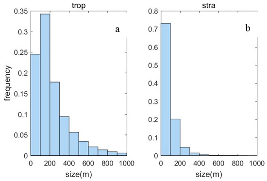 Figure 7a–b shows the frequency distribution of the turbulence overturn size from 2013 to 2018 in the troposphere and stratosphere, respectively. Generally speaking, the amount of turbulence decreases with the increase in the overturn size, and the scale of turbulence is dominated by a small scale. However, limited by the resolution of the sensor, the minimum overturn size detected here is 10 m. Through the experimental results of [25], we know that the turbulence detected by low-resolution detection (5–9 m) in the troposphere is only 7% of the high-resolution detection (10–20 cm), while in the stratosphere, the value is reduced to 4%. That is to say, the smaller-scale turbulence is undetectable, so the exploration of turbulence characteristics in this paper is based on the turbulence of a large vertical scale. In the troposphere, the most abundant turbulence scale is between 100 and 200 m, accounting for 34.2% of the total turbulence, while in the stratosphere, the most abundant turbulence scale is below 100 m, accounting for 73.0% of the total turbulence. The overturn size that exceeds 100 m accounts for 75.5% in the troposphere, and even 39.7% of the turbulence scales can exceed 500 m. As for the stratosphere, the overturn size that exceeds 500 m only accounts for 3.0% of the total turbulence.