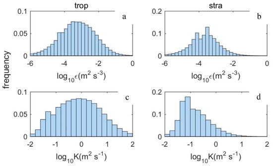 Histogram of the frequency distribution of (a) tropospheric energy dissipation rate, (b) stratospheric energy dissipation rate, (c) tropospheric diffusion coefficient, (d) stratospheric diffusion coefficient.
