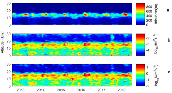 Figure 9 shows the time series of atmospheric column characteristics from 2013 to 2018; Figure 9a–c show the monthly means of the turbulence thickness, turbulent energy dissipation rate and turbulent diffusion coefficient, respectively. There is a region with large turbulence scales that range between 11 and 16 km, in which the maximum turbulence thickness also appears in July–September every year, showing the same annual oscillations (AO) as the Thorpe length since they are directly physically related. Turbulence scales in this region range from 300 to 1000 m. Below 10 km, the turbulence thickness is within 200 m, and the thickness also varies alternately with time. In the stratosphere, the turbulence thickness is relatively small, with the average scale not exceeding 10 m after a 200 m vertically spaced average. The energy dissipation rate and turbulent diffusivity have the same distribution characteristics as the overturn size in the troposphere. From July to September, compared with other months, there are larger values of and in the upper troposphere, while the smaller values of and remain in the lower troposphere.