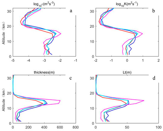 The results in the previous discussion clearly demonstrate the annual oscillation characteristics of turbulence parameters, and the period from July to September is when the turbulence scale and turbulence intensity are significantly enhanced. Therefore, we divided the six-year data into four groups: January–March, April–June, July–September and October–December; the data in each group were averaged according to a height interval of 2 km to obtain the distribution characteristics of the turbulence parameters with height in different seasons. The result is shown in Figure 10. Figure 10a–d shows the vertical distribution of , , turbulence thickness and Thorpe length, respectively (blue: January–March; red: April–June; magenta: July–September; cyan: October–December). The averaging was done across the whole data set.