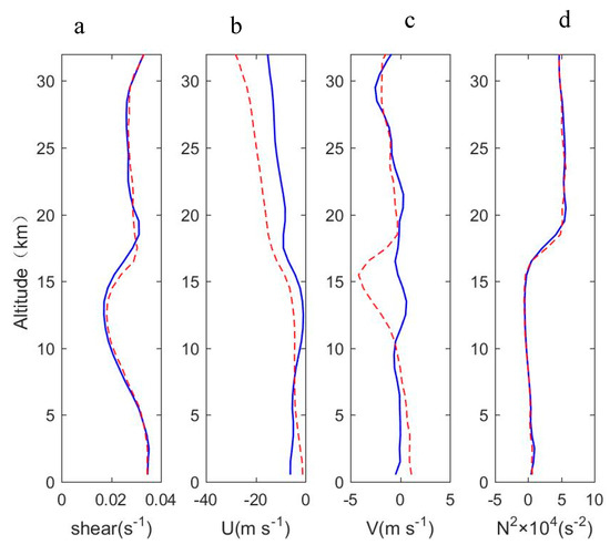 Vertical profiles of (a) wind shear, (b) zonal wind, (c) meridional wind, (d) buoyancy frequency (solid blue line: monthly means from 2013 to 2018; red dotted line: the means over six years, from July to September).