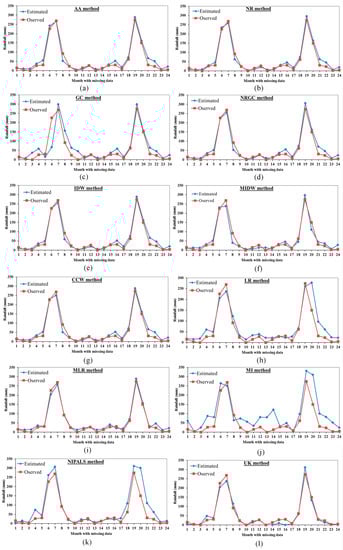 Figure 3 shows the results compared between the observed and estimated precipitation in respect to the monthly data of the year 2004 using the 21 different statistical methods. It can be seen that the estimated precipitation values almost match well with the observed values for the NR, MLR, IDW, MNR, NRGC, CCW, and AA methods. The MAE between the observed and estimated monthly precipitation for the year 2011 equals 15.274, 15.414, 15.506, 18.415, 19.108, 20.063, and 20.383 mm for the NR, MLR, IDW, MNR, NRGC, CCW, and AA methods respectively, while the RMSE equals 21.879, 22.468, 21.828, 26.935, 25.569, 27.269, and 28.975 mm for the same methods, respectively. The results of NR, MLR, IDW, MNR, NRGC, CCW, and AA appear to be more reliable and accurate compared with other methods. The correlation coefficients between the estimated and observed precipitation equal 0.970, 0.974, 0.970, 0.976, 0.959, 0.956, and 0.957 for NR, MLR, IDW, MNR, NRGC, CCW, and AA, respectively. On the other hand, the results of UK, LR, MI, and EM show the lowest accuracy as the monthly estimated values do not match the observed values. The MAE of the UK, LR, MI, and EM methods equals 18.867, 23.411, 40.815, and 42.675 mm, with RMSE equal to 27.728, 29.056, 52.354, and 56.208 mm, respectively. The results of Figure 4, for comparison between estimated monthly data with observed values for the year 2004, confirm the results of Figure 2 for estimating random missing data and the analysis of Table 5.