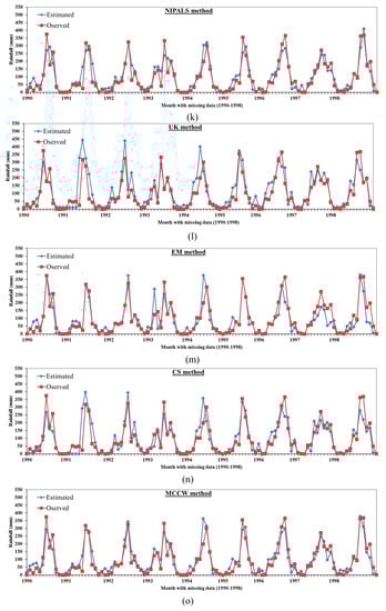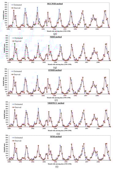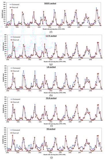 Figure 5 shows the compared results between the observed and estimated precipitation in respect to the monthly data of the period from 1990 to 1998 using the 21 different statistical methods. It can be seen that the estimated precipitation values almost match well with the observed values for the NR, NRID, NRGC, MLR, ONRID, MNR, IDW, and CCW methods. The correlation coefficients between the estimated and observed precipitation equal 0.9313, 0.9192, 0.9243, 0.9260, 0.9313, 0.9323, 0.999, and 0.9217 for NR, NRID, NRGC, MLR, ONRID, MNR, IDW, and CCW, respectively. The MAE between the observed and estimated monthly precipitation for the period from 1990 to 1998 equals 26.64, 26.69, 26.72, 26.80, 27.17, 27.60, 27.84, and 30.18 mm for the NR, NRID, NRGC, MLR, ONRID, MNR, IDW, and CCW methods, respectively, while the RMSE equals 38.28, 41.46, 40.51, 39.09, 41.13, 39.21, 39.47, and 40.89 mm for the same methods, respectively. The results of NR, MLR, IDW, and CCW appear to be more reliable and accurate compared with other methods. On the other hand, the results of EM, CS, UK, LR, and MI show the lowest accuracy as the monthly estimated values do not match the observed values. The MAE of the EM, CS, UK, LR, and MI methods equals 28.03, 34.33, 38.93, 39.07, and 48.52 mm with RMSE equal to 48.23, 53.03, 58.49, 58.23, and 59.71 mm, respectively. The results of Figure 5, for comparison between estimated monthly data with observed values for the years from 1990 to 1998, confirm the results of Figure 2, Figure 3 and Figure 4 for estimating missing data and the analysis of Table 5.