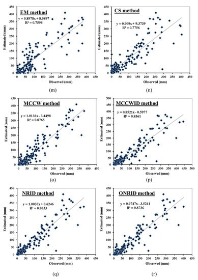 Scatter plot of estimated and observed precipitation values for different methods: (a), AA; (b), NR; (c), GC; (d), NRGC; (e), IDW; (f), MIDW; (g), CCW; (h), LR; (i), MLR; (j), MI; (k), NIPALS; (l), UK; (m), EM; (n), CS; (o), MCCW; (p), MCCWID; (q), NRID; (r), ONRID; (s), NRIDWCC; (t), MNR; (u), MNR-T.
