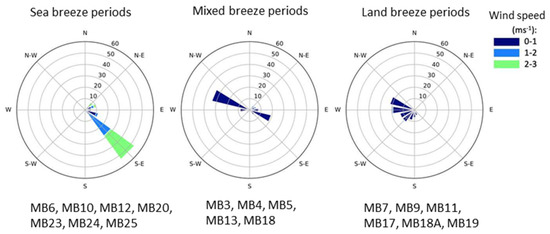 In addition to back trajectories, samples were classified according to the wind patterns to consider contribution of local sources. Wind data was recorded by a Thompson WS800 Meteorological Station located on the top of AIRBOX container, approximately two meters from the aerosol sampler. Samples were classified into three groups based on the dominating wind direction (Figure 2): sea breeze (samples MB6, MB10, MB12, MB20, MB23, MB24, MB25), land breeze (samples MB7, MB9, MB11, MB17, MB18A, MB19), and mixed breeze (samples MB3, MB4, MB5, MB13, MB18).