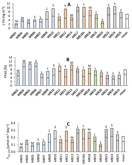 Budget of labile Fe in aerosol deposition. Fractions of soluble (down column) and leachable (upper column) Fe atmospheric concentrations (cFe) (A), fractional contributions to the total Fe pool (FFeS) (B), and dry deposition fluxes (Fdry (Fe))(C). Column colour indicates sample origin according to backward trajectories: blue- marine, orange- terrestrial, green- mixed, grey- land see land. Index above the column indicates the sample origin according to wind direction: S- sea breeze, M- mixed breeze, and L- land breeze.