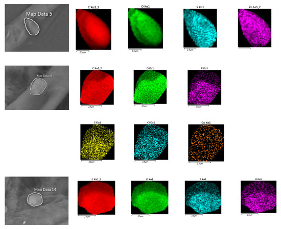 Observation of our samples by SEM confirm carbonaceous particulates were more abundant in some samples, particularly in these for which a high level of BC and LG was observed. Round shape particulates were more homogenously distributed across the filter area and their size range was more uniform compared to the minerals. These particles were 1–5 μm in size, which mainly consist of homogenously distributed C, P, and S. Some of the carbonaceous particles also contained homogenously distributed Zn, K, and Ca (Figure 5). These particles may be classified as tar balls, which is a common particle from natural and industrial biomass burning [91,92].