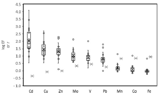 Enrichment factor (black whiskers-box) and Pearson correlation coefficient r with the mineral dust marker (Ti) (grey stars).
