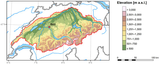Location of study domain (red polygon) within Switzerland. All data used in this study represent averages over this region.