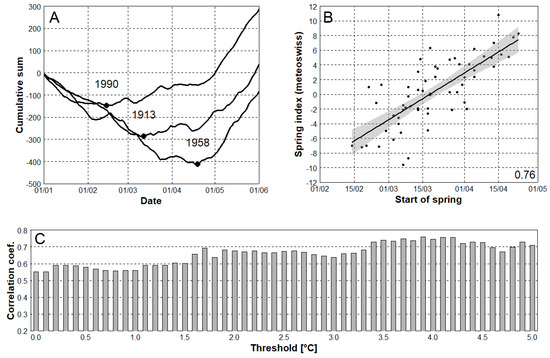In order to choose the most suitable TAS threshold for the whole domain, its selection was based on a best fit of station data to the Swiss spring index (Figure 2B), which was calculated from in-situ observations of the Swiss Phenology Network [34] (see Brugnara et al. 2020). It is based on the blooming dates (hazel bush, coltsfoot, wood anemone, cherry tree, dandelion, lady’s smock), new leaf formation (horse chestnut tree, hazel bush, beech tree) and new needle formation of the larch [20]. The first principal component is then used to determine the dimensionless deviation of start of spring from the long-term mean. Positive values of spring index indicate that spring vegetation developed later than expected based on the 1981–2010 average, while negative values show earlier vegetation development. TAS threshold values from 0.0 to 5.0 °C were tested for the overlapping 1951–2014 period, and the highest Pearson’s correlation coefficient (0.76) was related to the 3.9 °C threshold (Figure 2C). This threshold value was applied into all series analysed. The start of spring was defined as a date one day after the absolute minimum of the cumulative sum function (Figure 2A). Using the absolute minima of the cumulative sum functions, the method is robust against short term episodes of TAS above the selected threshold.