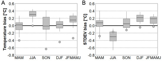 In order to assess creditability of the EXAR dataset, seasonal TAS and its standard deviation from the bias-corrected 20CRv2 reanalysis and the CORDEX RCMs were evaluated against station data in the 1971–2000 period. The 15-member CORDEX ensemble performed well except for summer, when all simulations had a positive TAS bias ranging from 0.1 to 0.4 °C. For the 6 month period in the first half of the year (JFMAMJ, essential for the spring frost analysis), CORDEX tended to have a relatively small positive TAS bias, while a negative bias was found in 20CRv2. Overall, seasonal TAS was systematically lower in 20CRv2 compared to CORDEX (Figure 3A), which may be related to a combination of coarse resolution of original data and complex topography in the analysed domain (Section 2.1). CORDEX RCMs overestimated standard deviations of TAS (STDEV) in all seasons except summer, while standard deviation in 20CRv2 was smaller compared to station data through the year (especially in spring, Figure 3B). A higher (lower) value of STDEV in spring might be associated with more (less) severe frost events.