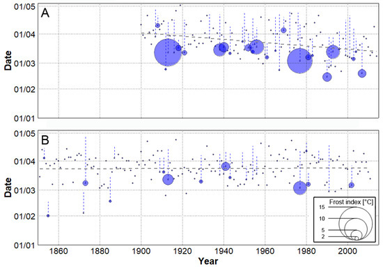 Interannual variability in starts of spring (grey dots) with their least-squares trends (grey dashed lines) for station data (A) and the bias-corrected 20th Century Reanalysis, version 2c (B). Blue circles highlight springs with frost event(s) and their size indicates the value of frost index. Blue dashed lines represent periods between a start of spring and a last frost event.