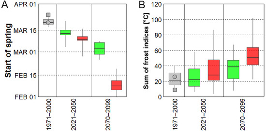 - Major differences between concentration scenarios were found at the end of the 21st century (2070–2099). The earliest starts of spring and the largest values of the sum of yearly frost indices were simulated under RCP 8.5, in which the mean date of spring start was February 9 (about 6 weeks earlier) and the sum of the yearly frost indices was larger by a factor of 2.9 compared to historical climate.