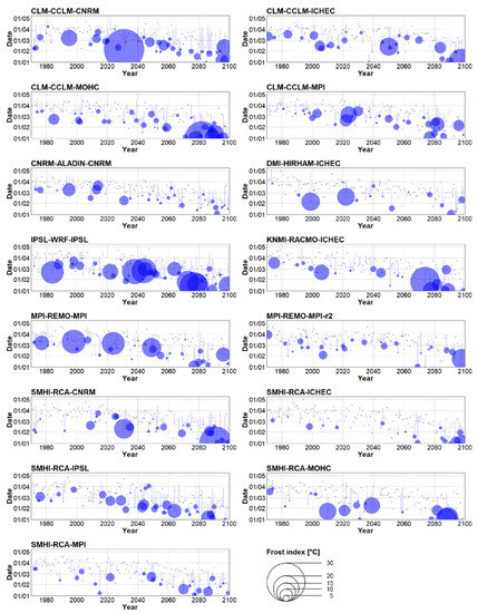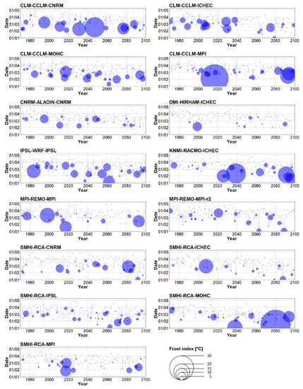 In the near future (2021–2050), spring tends to begin earlier in 13 out of 15 RCMs considering the RCP 4.5 concentration pathway and in all RCMs under RCP 8.5. Those changes are particularly significant under RCP 8.5 (Table 2). On average, the start of spring advances by 8 days under the RCP 4.5 scenario and by 12 days considering RCP 8.5. Inter-model spread was larger compared to the historical period (Figure 5A), and one ensemble member (SMHI-RCA-MOHC forced by RCP 8.5) shifted the average start of spring even to the end of February. The overall advancement of spring’s start was related to larger sums of the yearly frost indices (Figure 5B). In general, the sum of the yearly frost indices increased by a factor of 1.6 under RCP 8.5, and a slightly smaller increment (1.3) was simulated under RCP 4.5. This behaviour was model-dependent, however, because 5 out of 15 RCMs in both concentration scenarios simulated a decline of the frost index. In addition, the link between early (late) start of spring and high (low) frost index was not coherent in some RCMs. For example, the largest sum of the yearly frost indices (86.5 °C in IPSL-WRF-IPS under RCP 8.5) was associated with a rather typical average date for spring’s start for the 2021–2050 period. Moreover, the average starts of spring in KNMI-RACMO-ICHEC were identical in both concentration pathways, but the yearly sums of the frost indices differed substantially (Table 2). It should be noted, however, that these discrepancies might be linked to data sampling, because a severe frost event may occur outside the 30-year-long analysed periods (e.g., an exceptional frost event in model year 2017 simulated by CLM-CCLM-MPI forced by RCP 4.5, Figure 6).