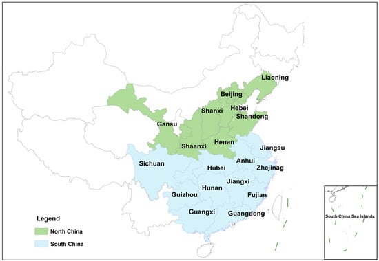 Study area in the paper. In the North China Plain: Beijing, Hebei, Shandong, and Henan; In the Loess Plateau: Shanxi, Shaanxi, and Gansu; In the Yangtze River Basin: Sichuan, Guizhou, Hubei, Hunan, Anhui, Jiangxi; Jiangsu, and Zhejiang; andIn the Jiangnan region: Fujian, Guangxi and Guangdong.