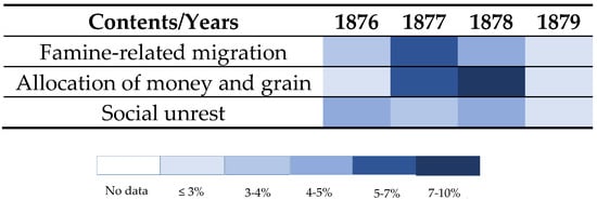 According to the records that contain clear time information of the events in 1877–1878 (Figure 6), the relief allocations and famine-related migrations appeared to be seasonal and temporary, and shared with a similar peak period, which was from October 1877 to May 1878. However, the duration of money and grain allocations was longer than that of famine-related migrations.