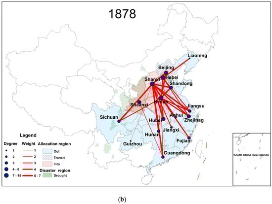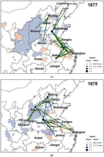 Firstly, we identified the records of famine-related migration, for example, “(1878) this year, there was a severe drought in Henan, and starving people moved to Xuzhou in search of food [35]” (Figure 3a). Then the migration route was noted down: Henan→Xuzhou.