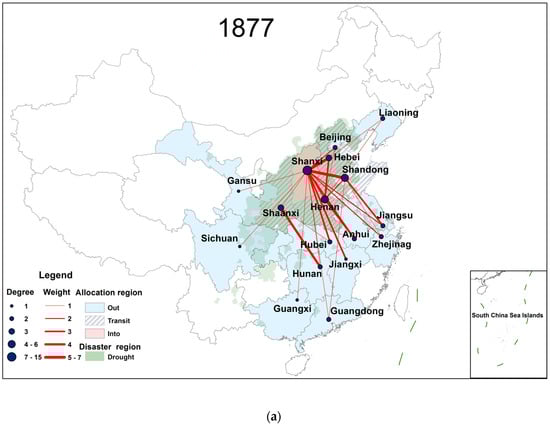 In 1877, a total of 17 provinces were involved in the allocation of money and grain (Figure 5). The main drought-stricken areas, Shanxi, Henan, Shandong, Shaanxi, and Hebei, received the most amount of silver and grain. From the perspective of spatial pattern, the allocation is featured with a core-ring structure: (1) Shanxi, lying in the core, received the most amount of silver and grain; (2) Shandong, Henan, and Hebei, lying on the second layer, received the relief from other provinces and also supplied resources for Shanxi; (3) Hunan, Anhui, Jiangxi, Jiangsu and other provinces in the Middle–Lower Yangtze Plain, lying on the most peripheral ring, experienced mainly the outflow of silver and grain. In 1877, the straight-line distances of silver and grain allocations were between 270 and 1635 km, and the average transfer distance was approximately 800 km.
