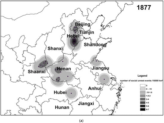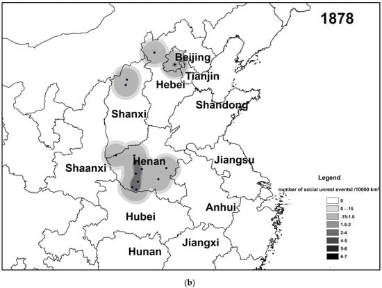 The regional interactions in social responses to the famine also profoundly influenced social stability. In 1877, more social unrest events (≥2–4/10,000 km2) took place in Henan, Shandong, Hebei, and Beijing (Figure 8), which were the main origins and destinations of the starving migrants. Very high unrest events density (≥6–7/10,000 km2) was found in Hebei. There were many reports of banditry and food robbery at the junction of Shaanxi, Shanxi, and Henan provinces. In 1878, the popular destination of famine migrants changed from the southern Jiangsu to Anhui, which made the social order of the former begin to improve. The places with a high density of social unrest events (≥2–4/10,000 km2) were recognized in Henan.