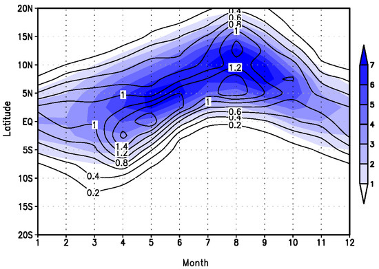 Time-latitude cross-section (averaged for 10° W–5° E) of the climatological mean precipitation (shading, mm day−1) and standard deviation (contour) (GPCP).