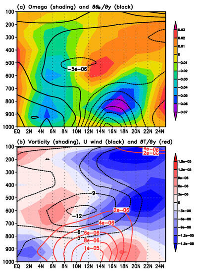 Over the African continent, the mid-level African easterly jet (dotted black line in Figure 5b) is induced by the positive meridional gradient of the air temperature at 12° N (red contour in Figure 5b) through the thermal wind balance. This easterly geostrophic flow causes a positive vorticity to the south (red) and negative vorticity to the north (blue shading) in the middle troposphere. The positive vorticity south of the African easterly jet is known to be associated with the African easterly waves and the WAM convection [2]. In general, over the Guinea Coast precipitation area (near the equator), the relative vorticity dominates the absolute vorticity, owing to the negligible planetary vorticity, and the quadrupole vorticity pattern in the pressure–latitude plane (shading in Figure 5b) reflects the first baroclinic mode of the tropical atmosphere; therefore, it is consistent with the tropical dynamics.