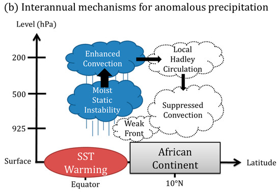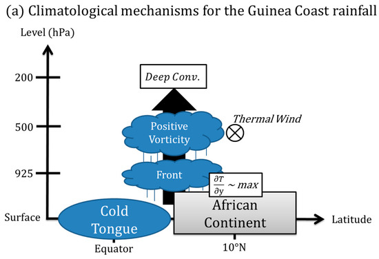 Schematic diagram of physical mechanisms for (a) the climatological Guinea Coast precipitation and (b) the interannual variation of precipitation in June.