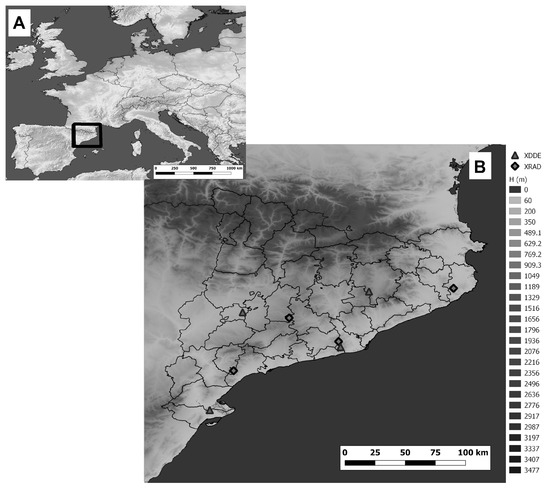 (A) General view of Western Europe. The black rectangle marks the study zone; (B) zoom view of Catalonia, the area of analysis, including the locations of the weather radars (diamonds) and lightning detectors (triangles).