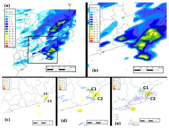 Figure 2. Process of the selection of the rainfall structures and assignation of the time, for the example of 2019/07/27 10:00 UTC: (a) Total hourly QPE field considering the radar and AWSs’ data, for the whole Catalan region (the black square shows the zoom to the area of analysis in the example). (b) Total hourly QPE field zoomed. (c) Converting pixels with QPE < 40 mm to Null. QPE cells C1 and C2 are labeled for the analysis shown in the following panels. (d) Comparison of the QPE areas of analysis (yellow ones, C1 and C2) with the centroids of the 6 min convective cells (blue dots) (the labels indicate the time of occurrence) in a zoomed region of the Central Coast of Catalonia. (e) The same as (d), but with the 6 min reflectivity regions exceeding 45dBZ (dashed line), at different times (colors indicate the hour and minute). - Relationship between hourly precipitation with LJ or without LJ (woLJ): For each event considered in the previous step, the QPE cells were selected and searched for the presence or not of one or more closed LJ. To link both phenomena (QPE cell and LJ), they must occur in a spatial distance < 50 km and a temporal range < 150 min. Those thresholds from the authors’ experience in 4 years of operational application of the algorithm were selected. Although not usual, it is possible to detect some LJ warnings in thunderstorms that have been produced 2 h or more before the occurrence of the event at the ground. Besides, the LJ notification is registered before (some minutes) the rainfall rate peak, in some particular cases. Continuing with the same situation of Figure 2 and Figure 3 shows the QPE cells C1, C2, and C3 and the LJ L1, L2, and L3 (in all events, the time on the right or at the bottom indicates the time of the maximum rainfall or the occurrence of the LJ, respectively). In the example of the figure, L2 and C3 are related. C3 initially was associated with two LJ, L2 and L3. Both warnings agreed with the restriction of distance, but only the first one verified the condition of time. On the other hand, L1 and L3 and C1 and C2 were independent phenomena because they were not supported by the time and space criteria. It is necessary to clarify that one LJ can be associated with more than one cell if both verify the previous rules. Once all the QPE cells of the full period have been labeled as LJ or woLJ, it is possible to start the other steps of the analysis. We classified the cells into three categories. First, were those cells associated with at least one LJ (in Figure 3, cell C3). refers to those QPE cells that took place during events with LJ, but they could not be linked with any warning because some of the spatial and time constraints were not verified (cells C1 and C2 in the same figure). Finally, occurred without any LJ on the same day. The first part of the analysis considered this classification (Section 3.1 and Section 3.2). On the other hand, a unique class () included the and categories in the last part of the study (Section 3.3 and Section 3.4). This change was because it only mattered if an LJ-cell relationship in the forecasting tasks existed or not.