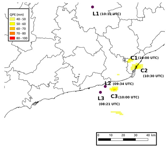 Figure 3. Criteria applied to connect the LJ (L1, L2, and L3) to the heavy rainfall cells (C1, C2, and C3). See the text for more information. - Characteristics of lightning activity: All the lightning recorded at a distance less than 50 km with respect to the precipitation’s centroid and 2 h before and after the maximum rainfall value were selected (see Figure 4). The number of IC, +CG, and –CG flashes was calculated for each QPE system, to observe the annual and monthly behavior and to compare the number of flashes between systems with and without LJ.