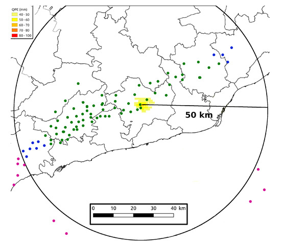 Figure 4. Criteria applied to connect CG flashes with the QPE centroid: green dots are those CG flashes that verify both criteria (time and space); blue dots are not valid because of the time with respect to the maxima rainfall moment; and purple dots are those not valid because of the criteria of space (or both). The black circle indicates the 50 km distance to the centroid of the QPE system. - Characteristics of weather radar detected convective cells: A similar criterion as used in Point 3 (characteristics of lightning activity) was applied to the radar characteristics (Figure 5). The convective cells selected in the study needed to be detected closer than 25 km with respect to the QPE centroid’s point and, also, a maximum of 2 h or later before the maximum rainfall instant. Through this selection, different radar parameters were studied such as TOP (maximum height of the thunderstorm), VIL (Vertical Integrated Liquid), and the height centroid (that is, the altitude where the mass center of the thunderstorm was located, considering the reflectivity instead of the mass), among others.