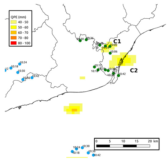 Figure 5. Criteria applied to connect radar convective cells with the QPE centroid: Green dots are those cells associated both systems C1 and C2 (because both were caused by the same rain system, it was impossible to discriminate if one or other thunderstorm was involved in both QPE cells). On the other hand, blue cells are rejected as contributors to C1 or C2. - Monthly and spatial distribution of the precipitation: The last step of the present analysis resulted in the monthly and spatial distribution of the QPE cells, to make a better characterization of them. In this case, both groups (with and without LJ) were analyzed. Furthermore, we evaluated the capability of the LJ for forecasting heavy rain events for the same time distributions, by means of different skill scores.