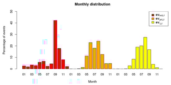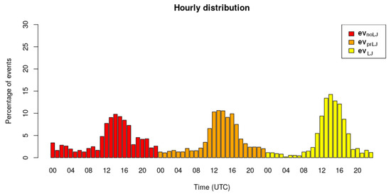 According to the classification of the events (with LJ, , without linked LJ, , and without LJ, ), the first behavior to be considered was the distribution by months and hours of the three sets of QPE cells. In the case of the two first categories, the monthly distribution was quite similar (see Figure 6), with a scarce probability of occurrence between January to April and October to December (10.9% for and only 8.0% for ) and a maximum comprised of June to August (65.2% for and 66.7% for ) coinciding with warm months. During this period, the high temperatures were favorable to developing clouds due to convection conditions. In the case of , the distribution varied notably, with 60.1% of the cases spread between September and October, while for the rest of the months, only May (5.8%), June (6.6%), and November (8.0%) exceeded 5%.