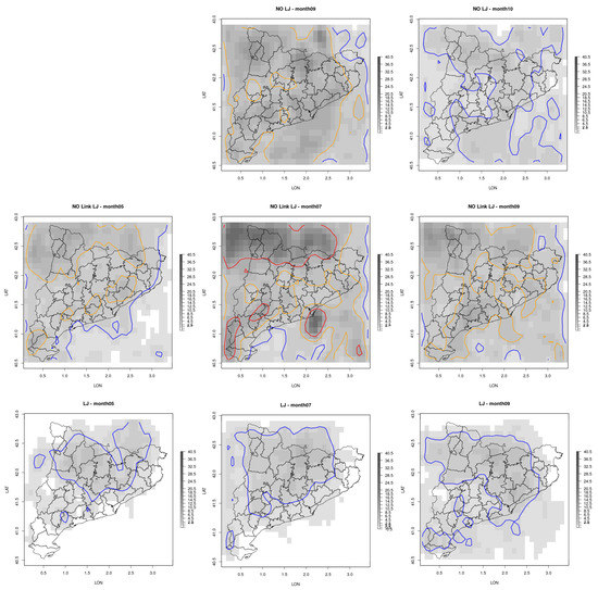 Monthly spatial distribution of the most representative cases of QPE cells without LJ (top), with non-linked LJ (center), and with LJ (bottom). Color lines indicate the limits of the areas with values over 2 (blue), 5 (orange), and 10 (red) events per month.