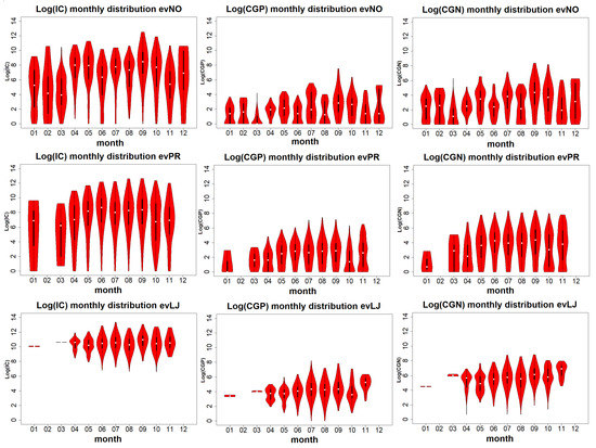 Violin plot of the monthly distribution in logarithmic scale of intra-cloud (left), positive cloud-to-ground (center), and negative cloud-to-ground (right) flashes associated the three type of events: without LJ (top), with non-linked LJ (center), and with LJ (bottom).