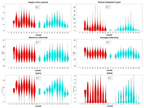 In this subsection, some characteristic radar data of or are studied and compared. The work in [56] gave a good hint about most of the radar parameters considered in the present study. It is important to keep in mind that this analysis was done contrasting the results between months, but this statistic could be slightly affected by the density of the sample in each. Firstly, the height of the thunderstorm centroid was analyzed. The median of the majority of located its centroid around 2 and 3 km from March to October. Considering the maximums, during the warmest months, from June to September, some centroids arrived at 6 km, while in the other months, the centroids were less than 5 km. In any case, the median values for the whole period were located at a 3 km height. This was caused by convective conditions produced by warm air, which allowed a more significant vertical development (top left image of Figure 10). The same figure shows that the centroids of were found at slightly lower levels: the median was around 2 km and their maximums were until 5.5 km in July and August. The big difference with the previous group was the observation of the centroid during winter months located between 1 or 2 km (in the case of , this parameter was null during this season).