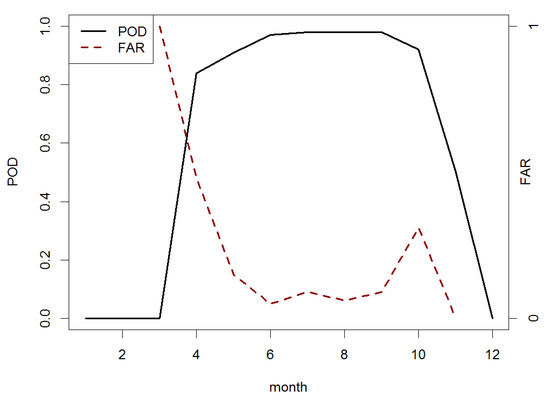 The POD (Probability Of Detection) and FAR (False Alarm) skill scores [59] were used to validate the LJ as a tool for forecasting heavy rainfall events (>40 mm in one hour). The POD parameter moved between zero (bad quality of the forecast) and zero (perfect forecast, or all the warnings correspond with an occurrence). In this study, higher values of POD corresponded to the period from April to October (>0.8), with the highest values from June to August (>0.95), coinciding with the warmest months. In the case of FAR, the values went also from zero to one, but with the opposite behavior (this meant that values close to zero implied good results). This parameter showed in general low values (good quality, that is few cases of warning implied a false alarm), overall during the warmest month. Then, these type of thunderstorms were formed by convective conditions, which produced, sometimes, severe weather. In this sense, the analysis in [4] showed, also, how the LJ was a good tool to forecast severe weather (Figure 11).