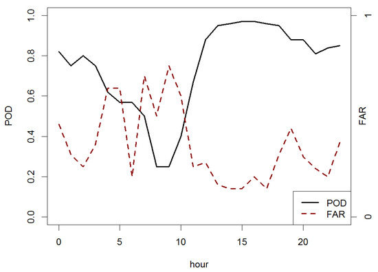 A good relationship between heavy rainfall and convective conditions was observed, once again, in the hourly evolution of POD and FAR (Figure 12). The maximum values of POD (good forecast) were observed between 14 and 17 UTC when the temperatures of the day were the highest (diurnal cycle of convection). From this time, the values of POD decreased a little until 0.85, while FAR increased, reaching 0.4. The majority of the thunderstorms, which affected Catalonia during summer months, usually developed in midday and could remain until night due to the high temperatures during all the afternoon (Figure 12). In the first part of the day, a pattern was not found, although the values of POD decreased, reaching the lowest values, around 8 and 9 UTC.