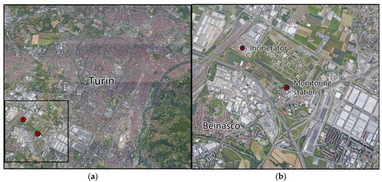 Google Earth maps showing the position of the incinerator and the monitoring station: (a) Turin metropolitan area; (b) zoom of the investigated site.