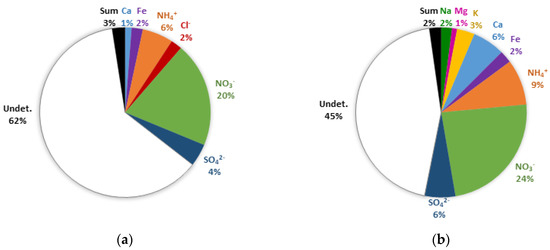 The inorganic composition of the analyzed samples collected in 2012 and 2014 are reported in Tables S4, S5 and S6, S7, respectively. As expected for urban PM10 samples, the major elements are Ca, Fe, K, Mg, and Na, and the major ions are Cl−, NH4+, NO3−, and SO42−. Figure 2 reports pie charts showing the average composition of the samples collected in the two sampling campaigns. The percentage of each analyte was calculated with respect to the gravimetric PM10 mass concentrations, therefore the undetermined portion of the PM10 (“Undet.” in the charts), most likely constituted by silicates, elemental carbon, and organic components, is also reported. The analytes representing less than 1% of the PM10 are globally represented under the heading “Sum”. The main difference among the average composition of 2012 and 2014 samples lies in the undetermined components, which decreased from 62% to 45%. Consequently, most of the other components (i.e., Ca, K, Mg, Na, NH4+, NO3−, and SO42−) represent a higher portion of the samples. Exceptions are Fe, which remained stable on 2%, and Cl−, which reduced from 2.1% to 0.6%.