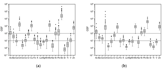 Box plots of crustal enrichment factors (CEFs) calculated with respect to the upper crust composition reported by Wedepohl [43] for (a) 2012 samples; (b) 2014 samples.
