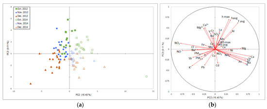 Score and loading plots obtained for PC2 vs. PC3 (16.40% and 9.11% of variance, respectively) are shown in Figure 4. PC2 allows an almost perfect separation of the samples collected in 2012 and 2014, as almost all of them have negative and positive scores on this PC, respectively. The variables having the highest negative loadings on PC2 are NO and NO2, while As, Ca, K, Na, Sr, and Zn have the highest positive loadings. Therefore, the latter group of analytes is characterized by higher concentrations in 2014 than in 2012 samples. The average temperature presents negative loadings on PC2 and positive loadings on PC3. Indeed, it is possible to see that the last three months of 2014 were generally warmer than the same months of 2012 and that, each year, the temperature lowered as the season progressed. As expected, the average and maximum mixing height are strongly correlated with the average temperature. Moreover, the coldest period of 2012 is characterized by the highest concentration of K+, a typical marker of biomass burning [40,44,45,46], probably due to a greater use of stoves and fireplaces for domestic heating.